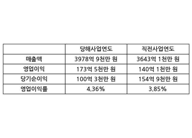 이번사업연도의 매출액은 직전사업연도 대비 9.21% 증가한 3978억 9천만 원, 영업이익은 173억 5천만 원, 당기순이익은 100억 3천만 원이라고 공시했다.