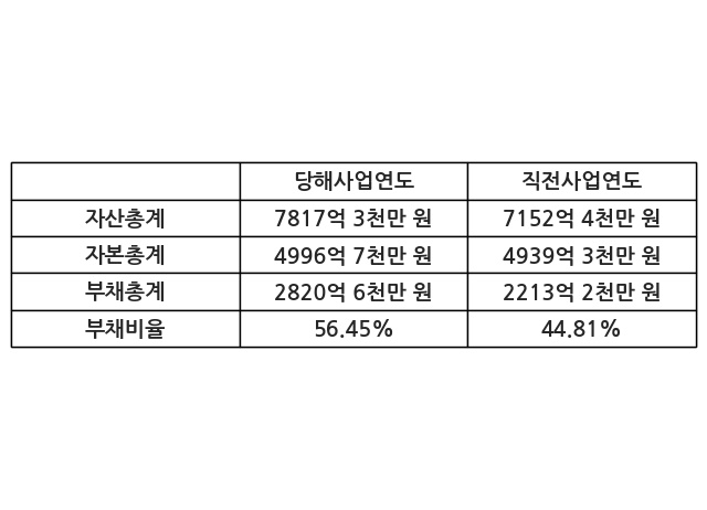 또한, 이번사업연도의 자산총계는 7817억 3천만 원으로 직전사업연도 대비 9.29% 증가한 한편, 부채총계는 2820억 6천만 원으로 27.45% 증가, 자본총계는 4996억 7천만 원으로 1.16% 증가했다.