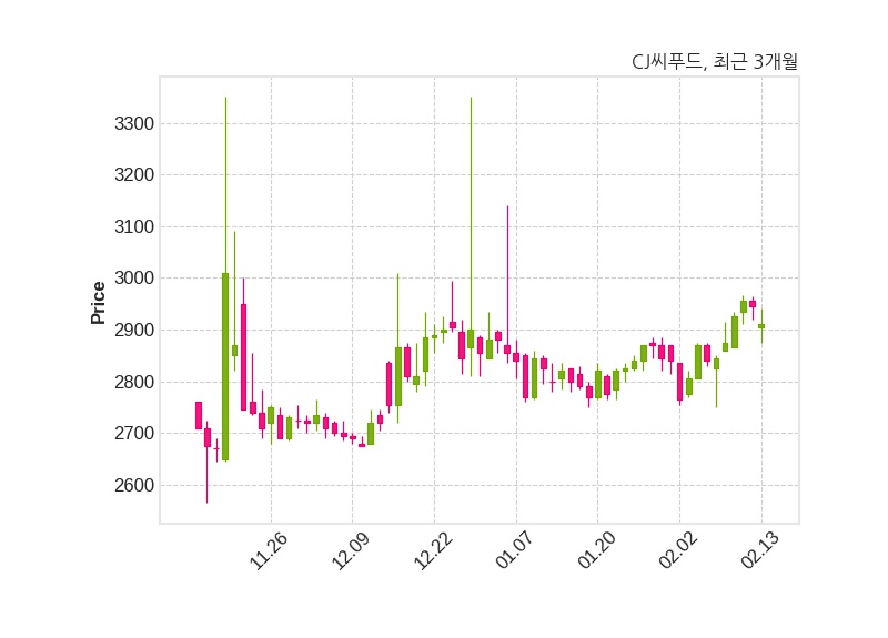 한편, CJ씨푸드의 12시 54분 현재주가는 2,910원으로 직전 거래일 대비 35원(-1.19%) 하락이며, 거래량은 227,346주이다.