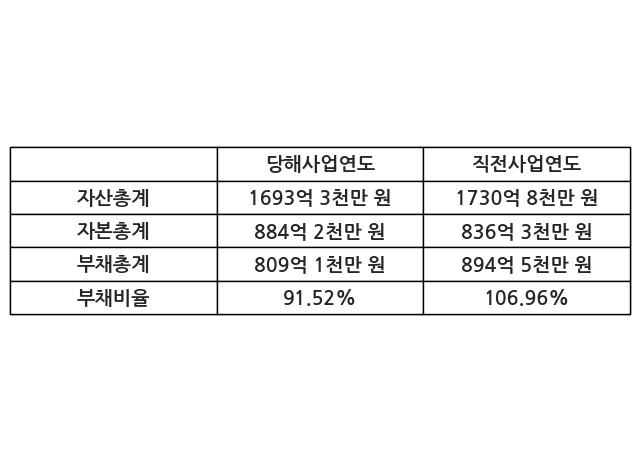 또한, 이번사업연도의 자산총계는 1693억 3천만 원으로 직전사업연도 대비 -2.17% 감소한 한편, 부채총계는 809억 1천만 원으로 -9.54% 감소, 자본총계는 884억 2천만 원으로 5.72% 증가했다.