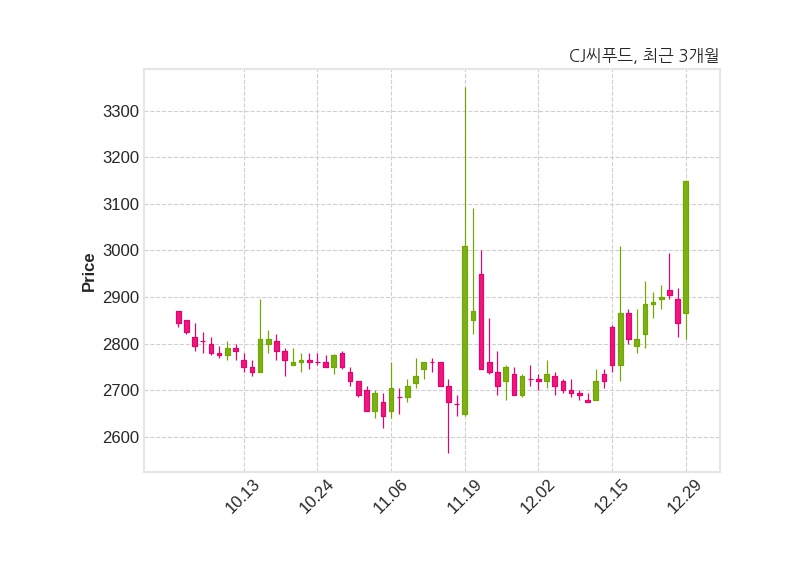 한편, CJ씨푸드의 13시 10분 현재주가는 3,150원으로 직전 거래일 대비 305원(+10.72%) 상승이며, 거래량은 831,260주이다.