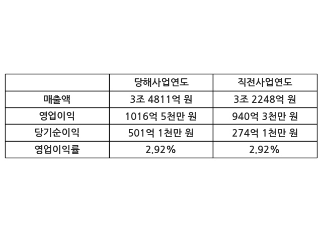 이번사업연도의 매출액은 직전사업연도 대비 7.95% 증가한 3조 4811억 원, 영업이익은 1016억 5천만 원, 당기순이익은 501억 1천만 원이라고 공시했다.