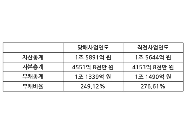 또한, 이번사업연도의 자산총계는 1조 5891억 원으로 직전사업연도 대비 1.58% 증가한 한편, 부채총계는 1조 1339억 원으로 -1.31% 감소, 자본총계는 4551억 8천만 원으로 9.58% 증가했다.
