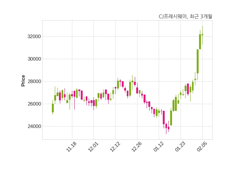 한편, CJ프레시웨이는 장 마감 이후 해당 기업공시를 발표했으며 오늘 종가가 32,200원, 거래량은 75,786주로, 직전 거래일 대비 변동이없다.