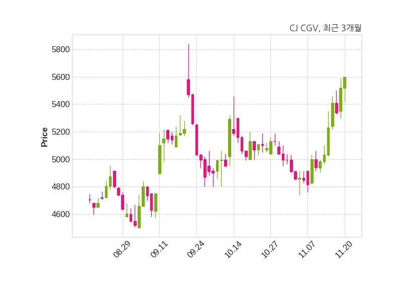 한편, CJ CGV은 장 마감 이후 해당 기업공시를 발표했으며 오늘 종가가 5,600원, 거래량은 734,251주로, 직전 거래일 대비 80원(+1.45%) 상승했다.