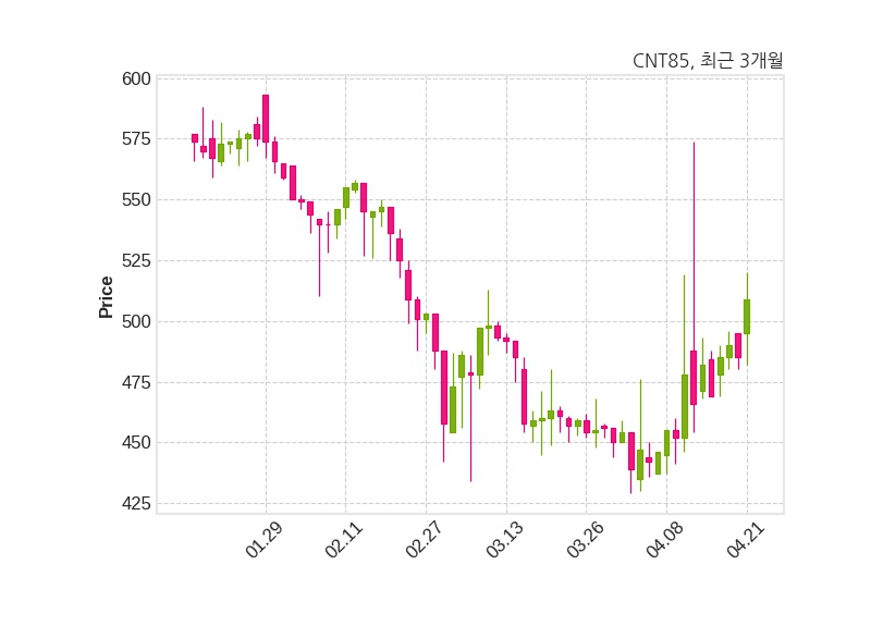 한편, CNT85은 장 마감 이후 해당 기업공시를 발표했으며 오늘 종가가 509원, 거래량은 90,998주로, 직전 거래일 대비 24원(+4.95%) 상승했다.