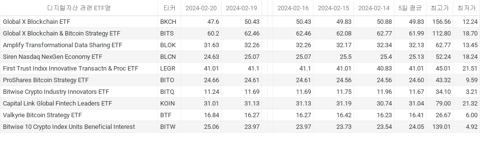 – Global X Blockchain ETF (BKCH) : 47.6 달러 (전일 대비 -2.83 달러 하락)