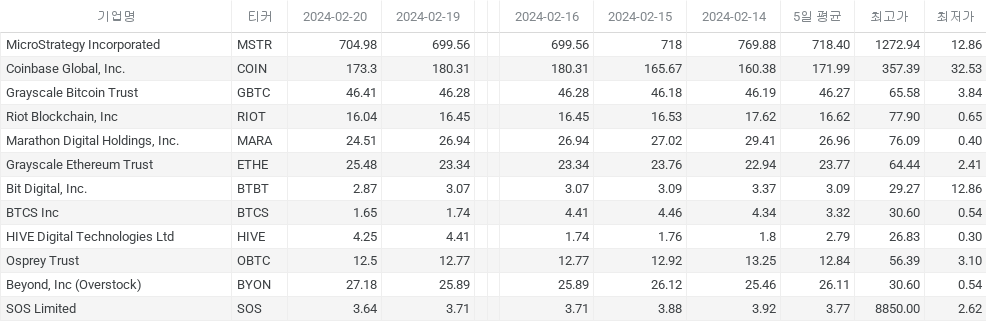 블록체인 주요 기업 및 ETF 주가