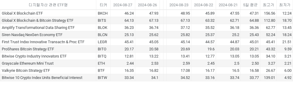 – Global X Blockchain ETF (BKCH) : 46.24 달러 (전일 대비 -1.69 달러 하락)
