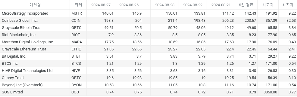 – MicroStrategy Incorporated (MSTR) : 140.01 달러 (전일 대비 -6.89달러 하락)