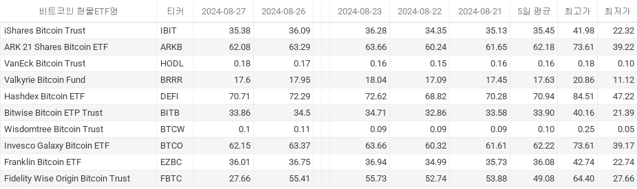 – Bitwise Bitcoin ETP Trust (BITB) : 33.86 달러 (전일 대비 -0.64달러 하락)