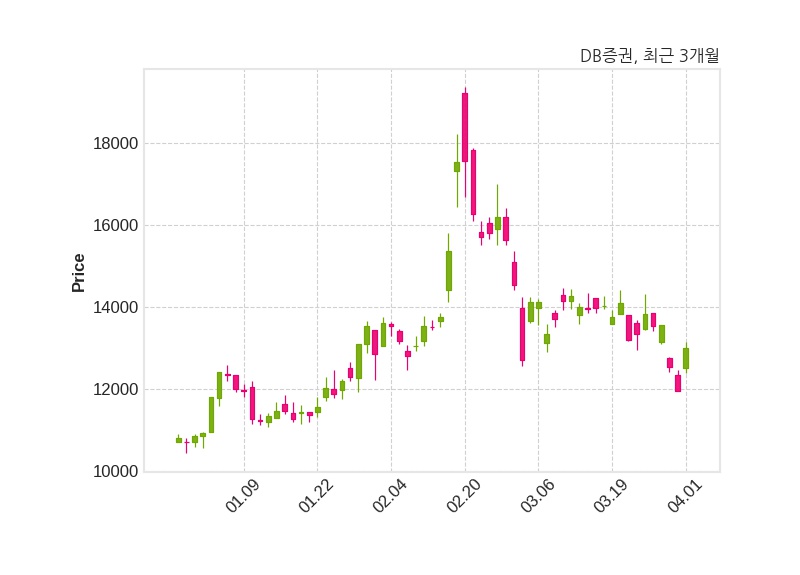 한편, DB증권은 장 마감 이후 해당 기업공시를 발표했으며 오늘 종가가 13,000원, 거래량은 100,148주로, 직전 거래일 대비 1,050원(+8.79%) 상승했다.