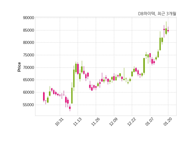 한편, DB하이텍은 장 마감 이후 해당 기업공시를 발표했으며 오늘 종가가 84,700원, 거래량은 268,555주로, 직전 거래일 대비 1,000원(-1.17%) 하락했다.
