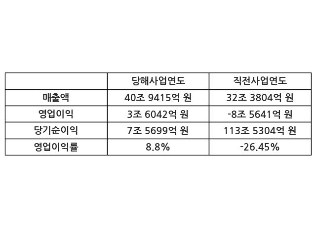 이번사업연도의 매출액은 직전사업연도 대비 26.44% 증가한 40조 9415억 원, 영업이익은 3조 6042억 원, 당기순이익은 7조 5699억 원이라고 공시했다.