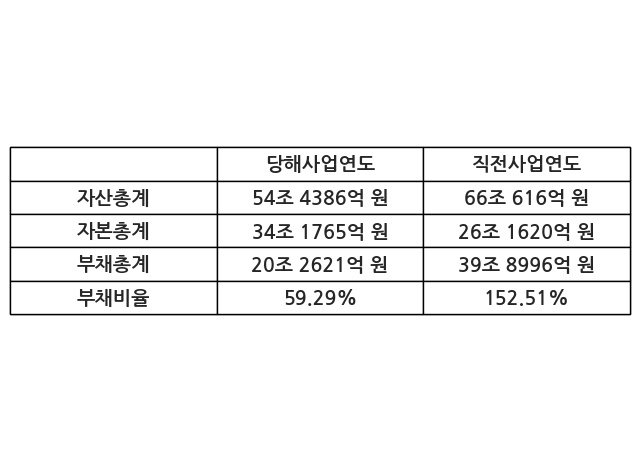 또한, 이번사업연도의 자산총계는 54조 4386억 원으로 직전사업연도 대비 -17.59% 감소한 한편, 부채총계는 20조 2621억 원으로 -49.22% 감소, 자본총계는 34조 1765억 원으로 30.63% 증가했다.