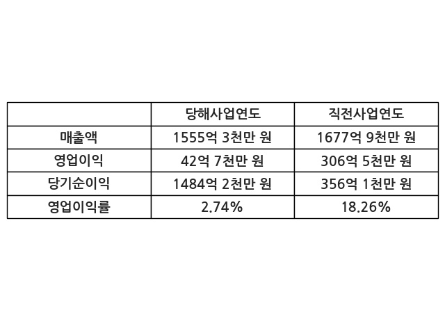 이번사업연도의 매출액은 직전사업연도 대비 -7.3% 감소한 1555억 3천만 원, 영업이익은 42억 7천만 원, 당기순이익은 1484억 2천만 원이라고 공시했다.