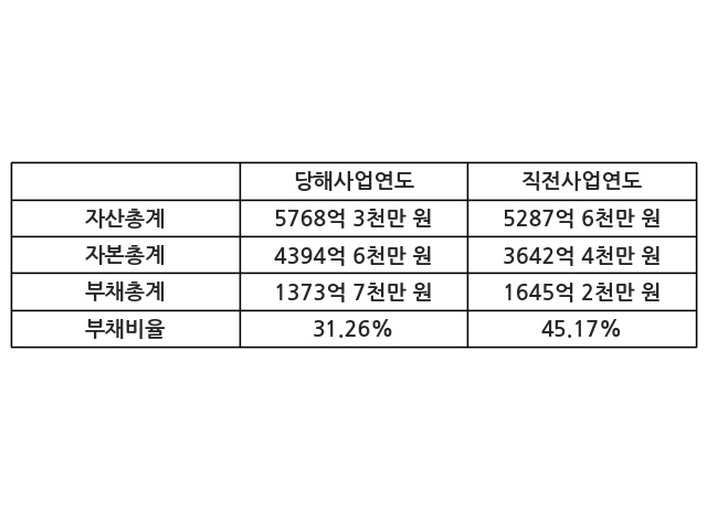 또한, 이번사업연도의 자산총계는 5768억 3천만 원으로 직전사업연도 대비 9.09% 증가한 한편, 부채총계는 1373억 7천만 원으로 -16.5% 감소, 자본총계는 4394억 6천만 원으로 20.65% 증가했다.
