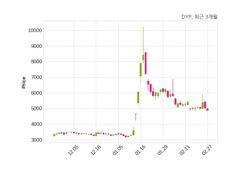 한편, DYP의 11시 01분 현재주가는 4,895원으로 직전 거래일 대비 135원(-2.68%) 하락이며, 거래량은 68,386주이다.