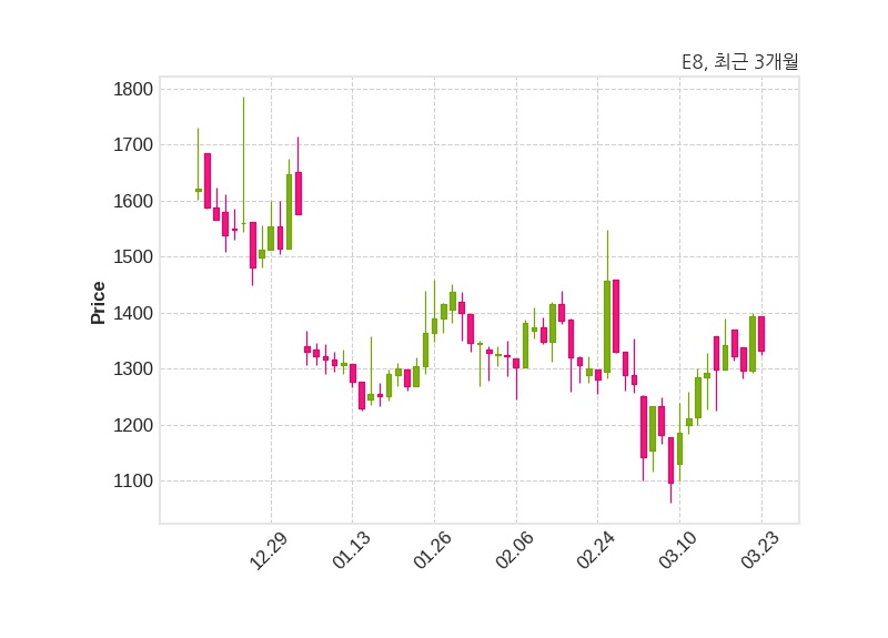 한편, E8의 11시 46분 현재주가는 1,332원으로 직전 거래일 대비 61원(-4.38%) 하락이며, 거래량은 50,564주이다.