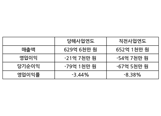 이번사업연도의 매출액은 직전사업연도 대비 -3.45% 감소한 629억 6천만 원, 영업이익은 -21억 7천만 원, 당기순이익은 -79억 1천만 원이라고 공시했다.