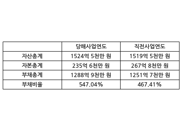또한, 이번사업연도의 자산총계는 1524억 5천만 원으로 직전사업연도 대비 0.33% 증가한 한편, 부채총계는 1288억 9천만 원으로 2.97% 증가, 자본총계는 235억 6천만 원으로 -12.02% 감소했다.