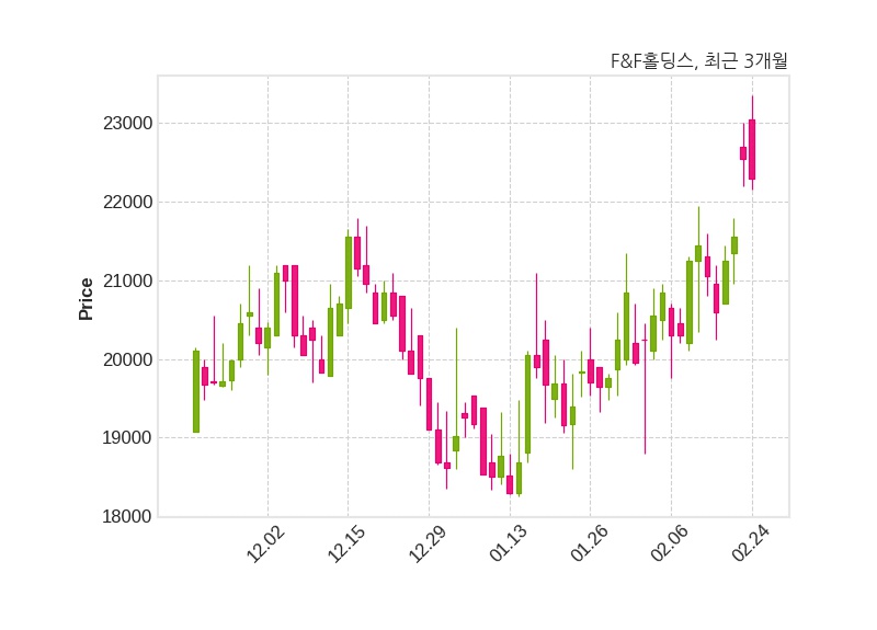 한편, F&F 홀딩스는 장 마감 이후 해당 기업공시를 발표했으며 오늘 종가가 22,300원, 거래량은 30,733주로, 직전 거래일 대비 250원(-1.11%) 하락했다.