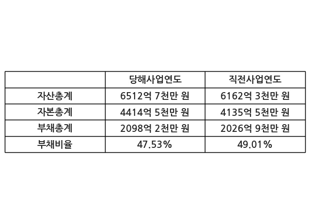 또한, 이번사업연도의 자산총계는 6512억 7천만 원으로 직전사업연도 대비 5.69% 증가한 한편, 부채총계는 2098억 2천만 원으로 3.52% 증가, 자본총계는 4414억 5천만 원으로 6.75% 증가했다.