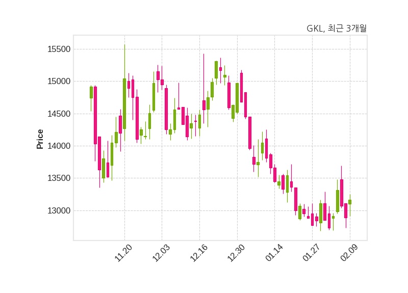 한편, GKL은 장 마감 이후 해당 기업공시를 발표했으며 오늘 종가가 13,160원, 거래량은 306,497주로, 직전 거래일 대비 270원(+2.09%) 상승했다.