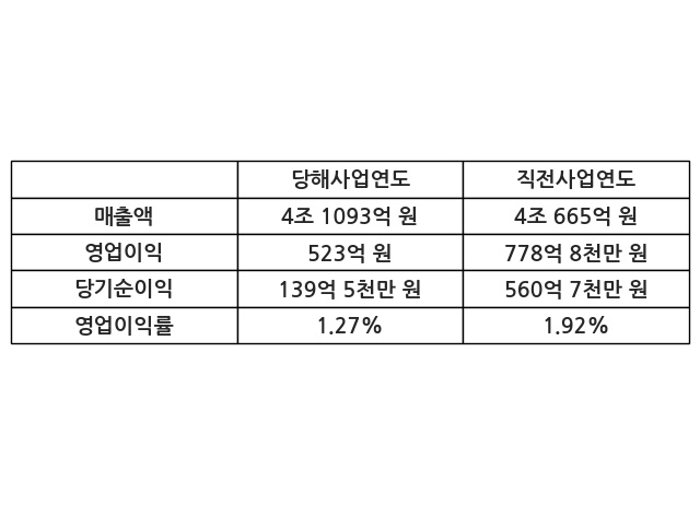 이번사업연도의 매출액은 직전사업연도 대비 1.05% 증가한 4조 1093억 원, 영업이익은 523억 원, 당기순이익은 139억 5천만 원이라고 공시했다.