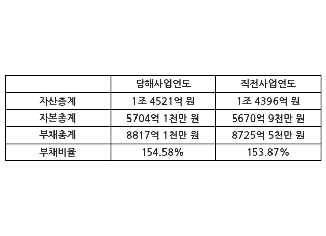 또한, 이번사업연도의 자산총계는 1조 4521억 원으로 직전사업연도 대비 0.87% 증가한 한편, 부채총계는 8817억 1천만 원으로 1.05% 증가, 자본총계는 5704억 1천만 원으로 0.59% 증가했다.