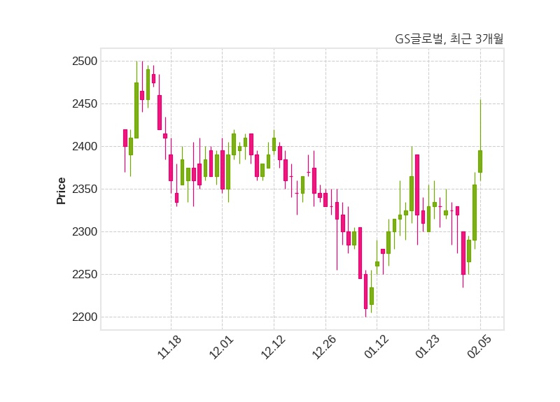 한편, GS글로벌의 13시 52분 현재주가는 2,395원으로 직전 거래일 대비 40원(+1.7%) 상승이며, 거래량은 1,137,435주이다.