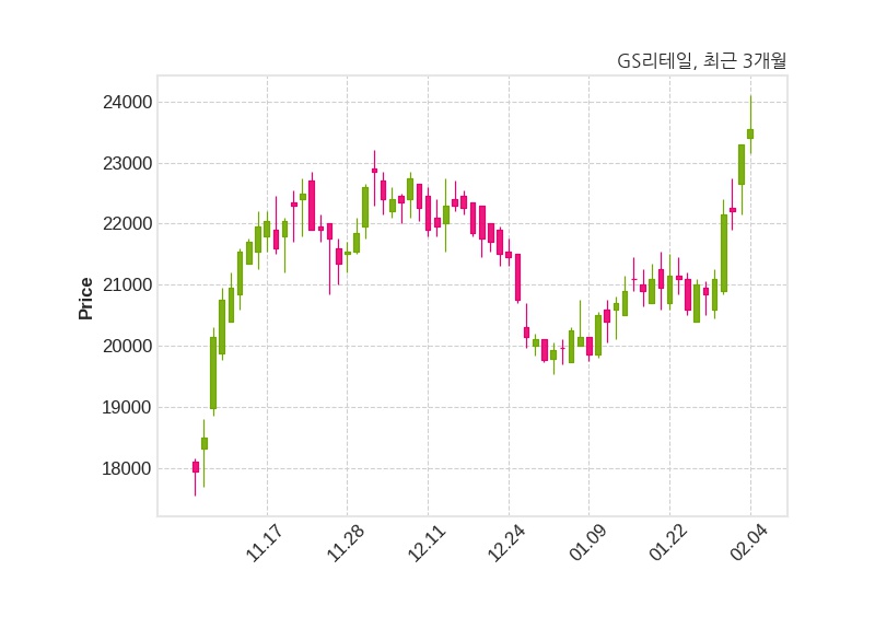 한편, GS리테일은 장 마감 이후 해당 기업공시를 발표했으며 오늘 종가가 23,550원, 거래량은 202,340주로, 직전 거래일 대비 250원(+1.07%) 상승했다.