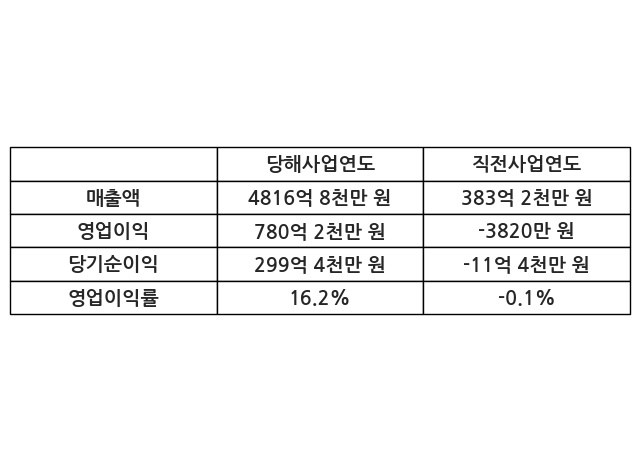 이번사업연도의 매출액은 직전사업연도 대비 1156.95% 증가한 4816억 8천만 원, 영업이익은 780억 2천만 원, 당기순이익은 299억 4천만 원이라고 공시했다.
