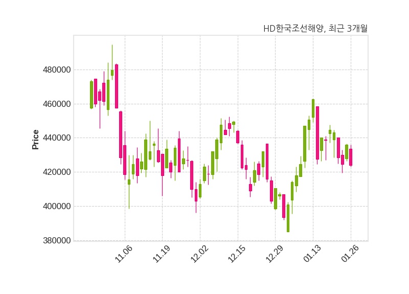 한편, HD한국조선해양은 장 마감 이후 해당 기업공시를 발표했으며 오늘 종가가 424,000원, 거래량은 142,650주로, 직전 거래일 대비 12,000원(-2.75%) 하락했다.