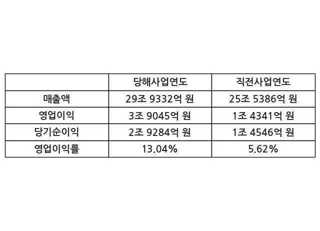 이번사업연도의 매출액은 직전사업연도 대비 17.21% 증가한 29조 9332억 원, 영업이익은 3조 9045억 원, 당기순이익은 2조 9284억 원이라고 공시했다.