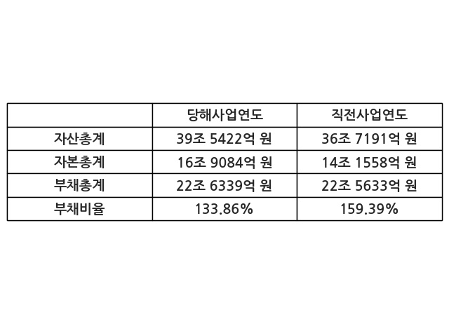 또한, 이번사업연도의 자산총계는 39조 5422억 원으로 직전사업연도 대비 7.69% 증가한 한편, 부채총계는 22조 6339억 원으로 0.31% 증가, 자본총계는 16조 9084억 원으로 19.45% 증가했다.