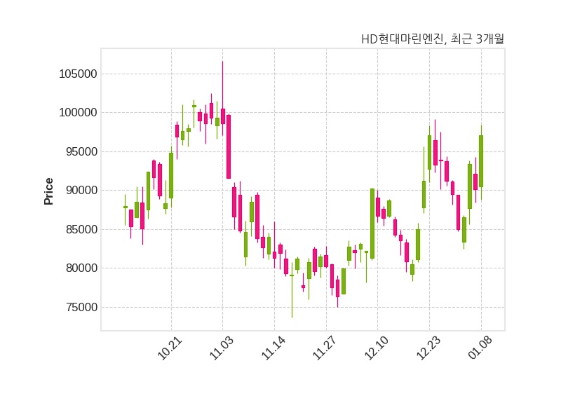 한편, HD현대마린엔진의 09시 32분 현재주가는 97,100원으로 직전 거래일 대비 7,000원(+7.77%) 상승이며, 거래량은 178,550주이다.