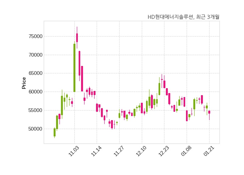 한편, HD현대에너지솔루션은 장 마감 이후 해당 기업공시를 발표했으며 오늘 종가가 54,200원, 거래량은 182,557주로, 직전 거래일 대비 2,000원(-3.56%) 하락했다.