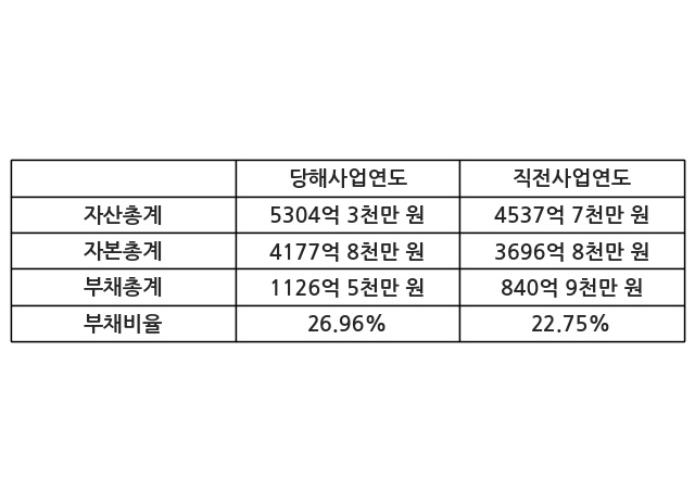 또한, 이번사업연도의 자산총계는 5304억 3천만 원으로 직전사업연도 대비 16.89% 증가한 한편, 부채총계는 1126억 5천만 원으로 33.96% 증가, 자본총계는 4177억 8천만 원으로 13.01% 증가했다.