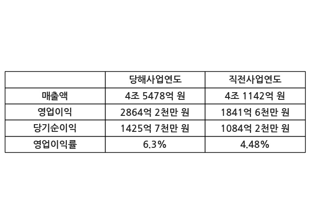 이번사업연도의 매출액은 직전사업연도 대비 10.54% 증가한 4조 5478억 원, 영업이익은 2864억 2천만 원, 당기순이익은 1425억 7천만 원이라고 공시했다.
