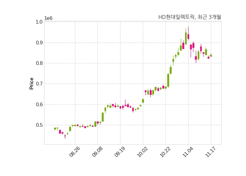 한편, HD현대일렉트릭은 장 마감 이후 해당 기업공시를 발표했으며 오늘 종가가 840,000원, 거래량은 111,375주로, 직전 거래일 대비 16,000원(+1.94%) 상승했다.