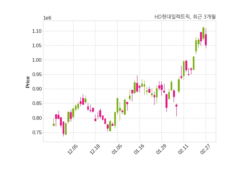 한편, HD현대일렉트릭의 15시 24분 현재주가는 1,052,000원으로 직전 거래일 대비 59,000원(-5.31%) 하락이며, 거래량은 266,095주이다.