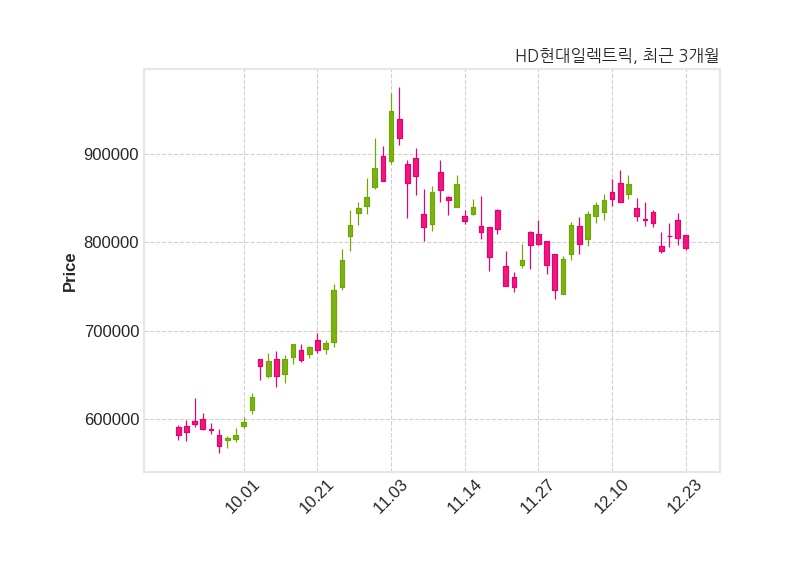 한편, HD현대일렉트릭은 장 마감 이후 해당 기업공시를 발표했으며 오늘 종가가 794,000원, 거래량은 67,355주로, 직전 거래일 대비 11,000원(-1.37%) 하락했다.