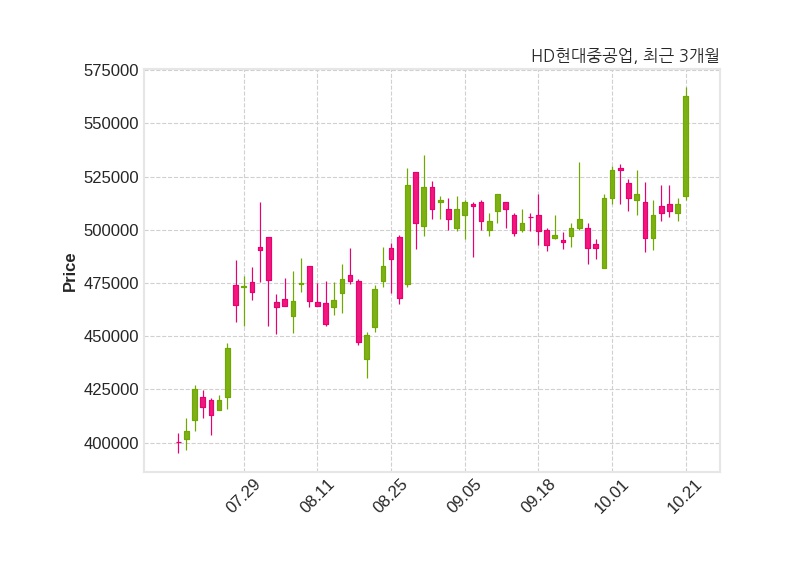 한편, HD현대중공업은 장 마감 이후 해당 기업공시를 발표했으며 오늘 종가가 563,000원, 거래량은 497,022주로, 직전 거래일 대비 51,000원(+9.96%) 상승했다.