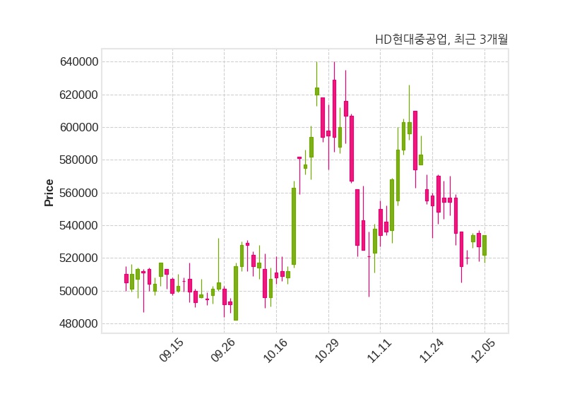 한편, HD현대중공업은 장 마감 이후 해당 기업공시를 발표했으며 오늘 종가가 534,000원, 거래량은 122,342주로, 직전 거래일 대비 7,000원(+1.33%) 상승했다.