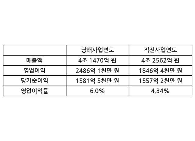 이번사업연도의 매출액은 직전사업연도 대비 -2.57% 감소한 4조 1470억 원, 영업이익은 2486억 1천만 원, 당기순이익은 1581억 5천만 원이라고 공시했다.