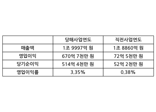 이번사업연도의 매출액은 직전사업연도 대비 6.03% 증가한 1조 9997억 원, 영업이익은 670억 7천만 원, 당기순이익은 514억 4천만 원이라고 공시했다.