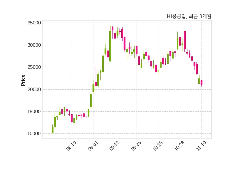 한편, HJ중공업의 09시 14분 현재주가는 21,100원으로 직전 거래일 대비 1,350원(-6.01%) 하락이며, 거래량은 868,497주이다.