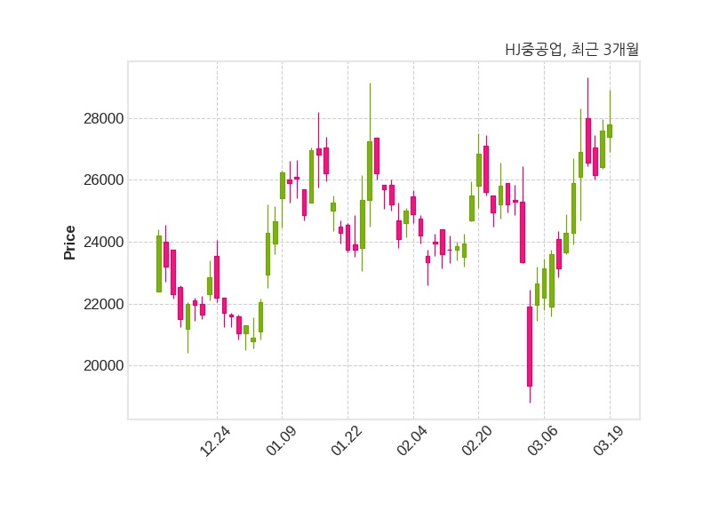 한편, HJ중공업은 장 마감 이후 해당 기업공시를 발표했으며 오늘 종가가 27,800원, 거래량은 2,822,765주로, 직전 거래일 대비 200원(+0.72%) 상승했다.