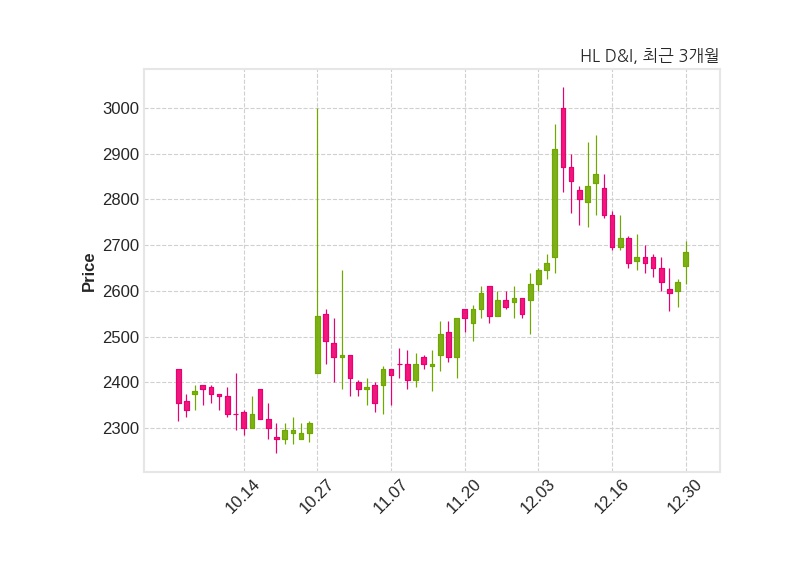 한편, HL D&I의 15시 05분 현재주가는 2,685원으로 직전 거래일 대비 65원(+2.48%) 상승이며, 거래량은 65,102주이다.